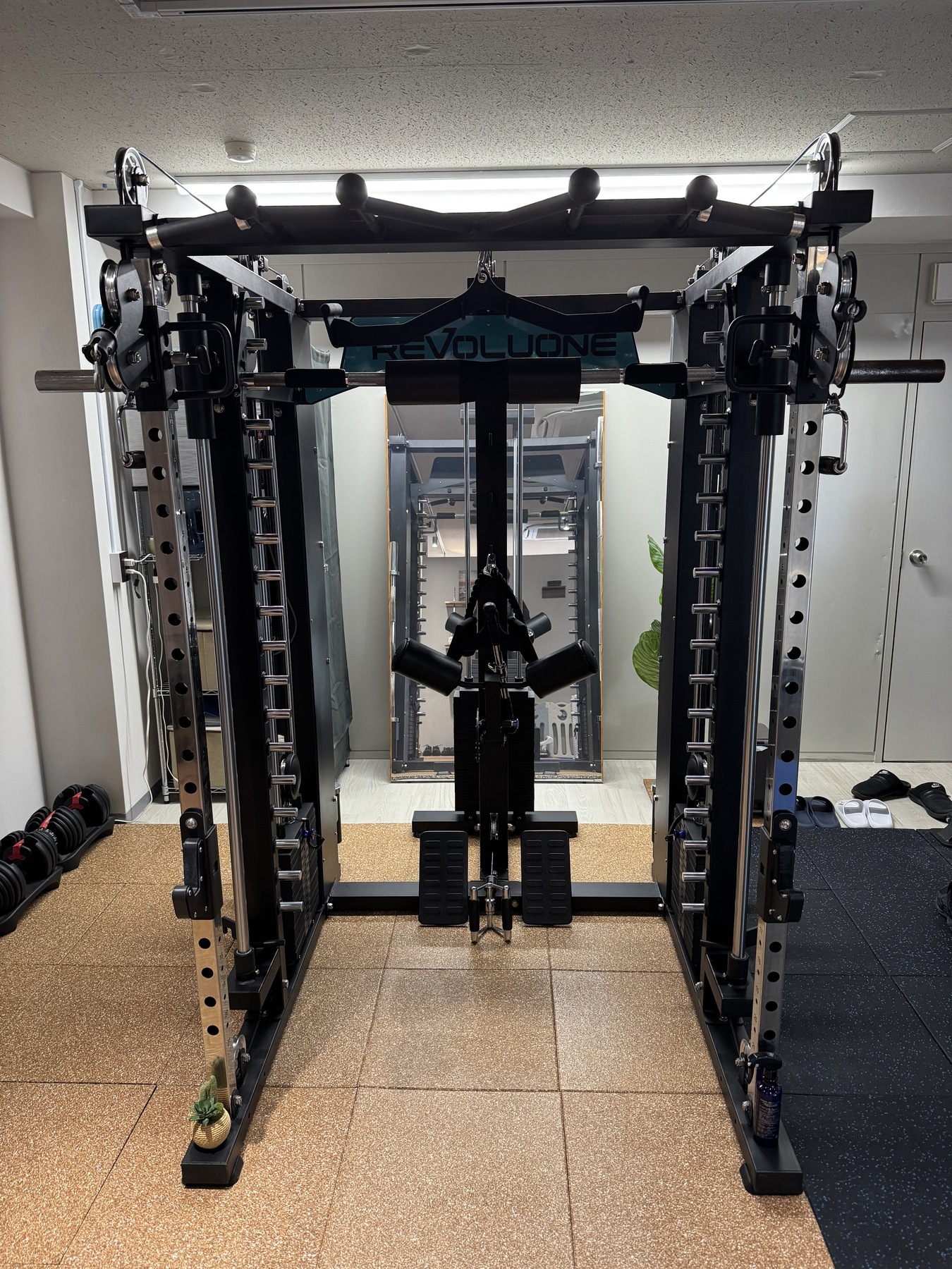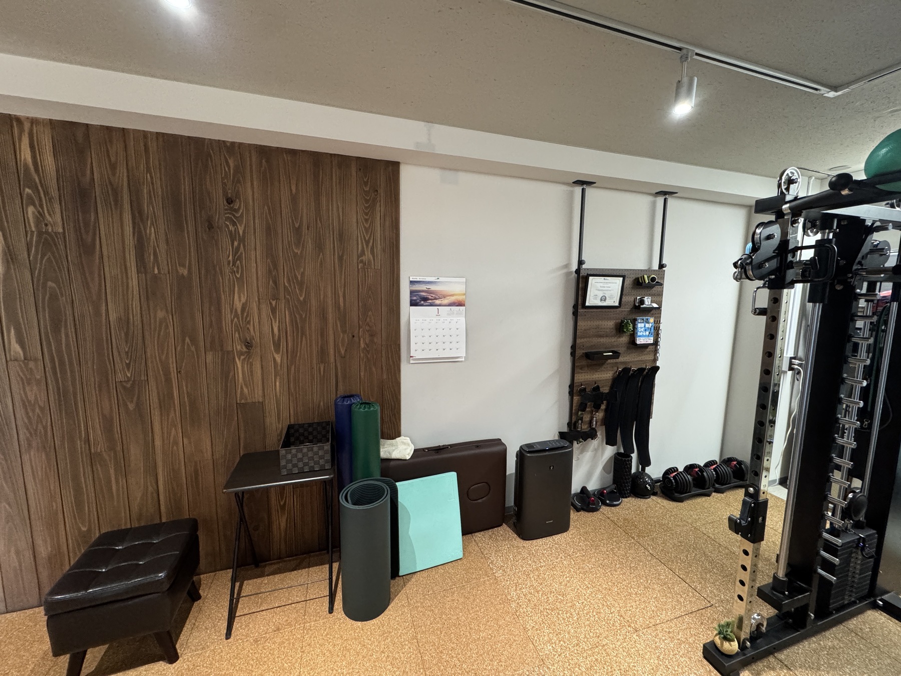 集中できるパーソナルスペースでオールインワンスミスマシンを配備しておりますので行える種目数が豊富です。その他可変式ダンベル、ストレッチポール、フォームローラー、ヨガマット、アブローラー、プッシュアップバー、チューブ、ベルト、グリップ等完備しております。