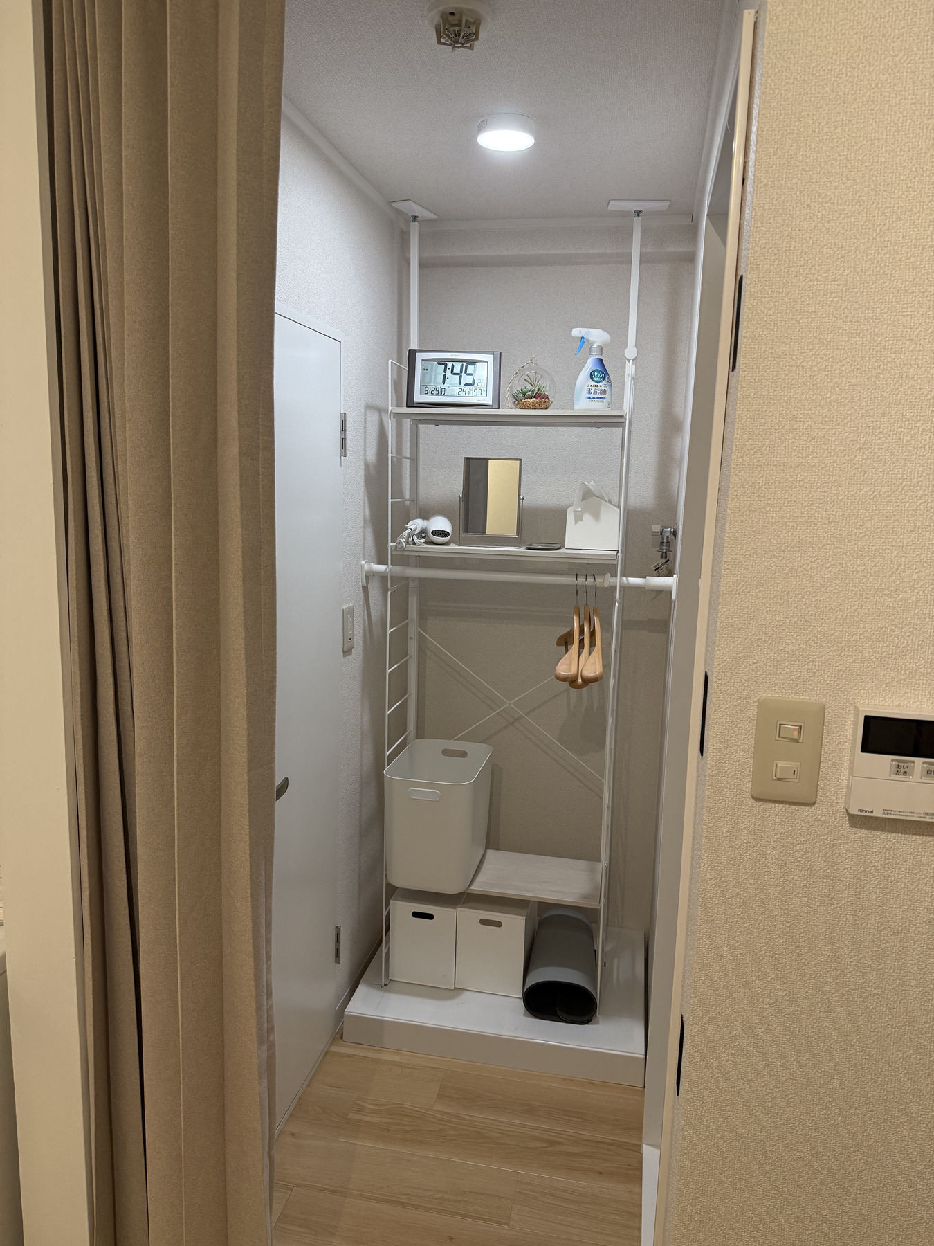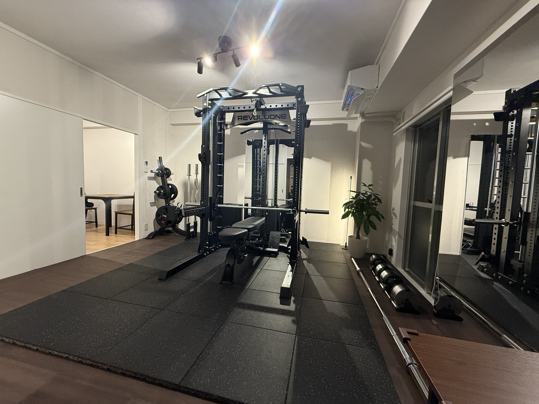 トレーニングルームの電気は、2枚目写真にございます3段棚の1番上にリモコンで操作をお願いいたします。